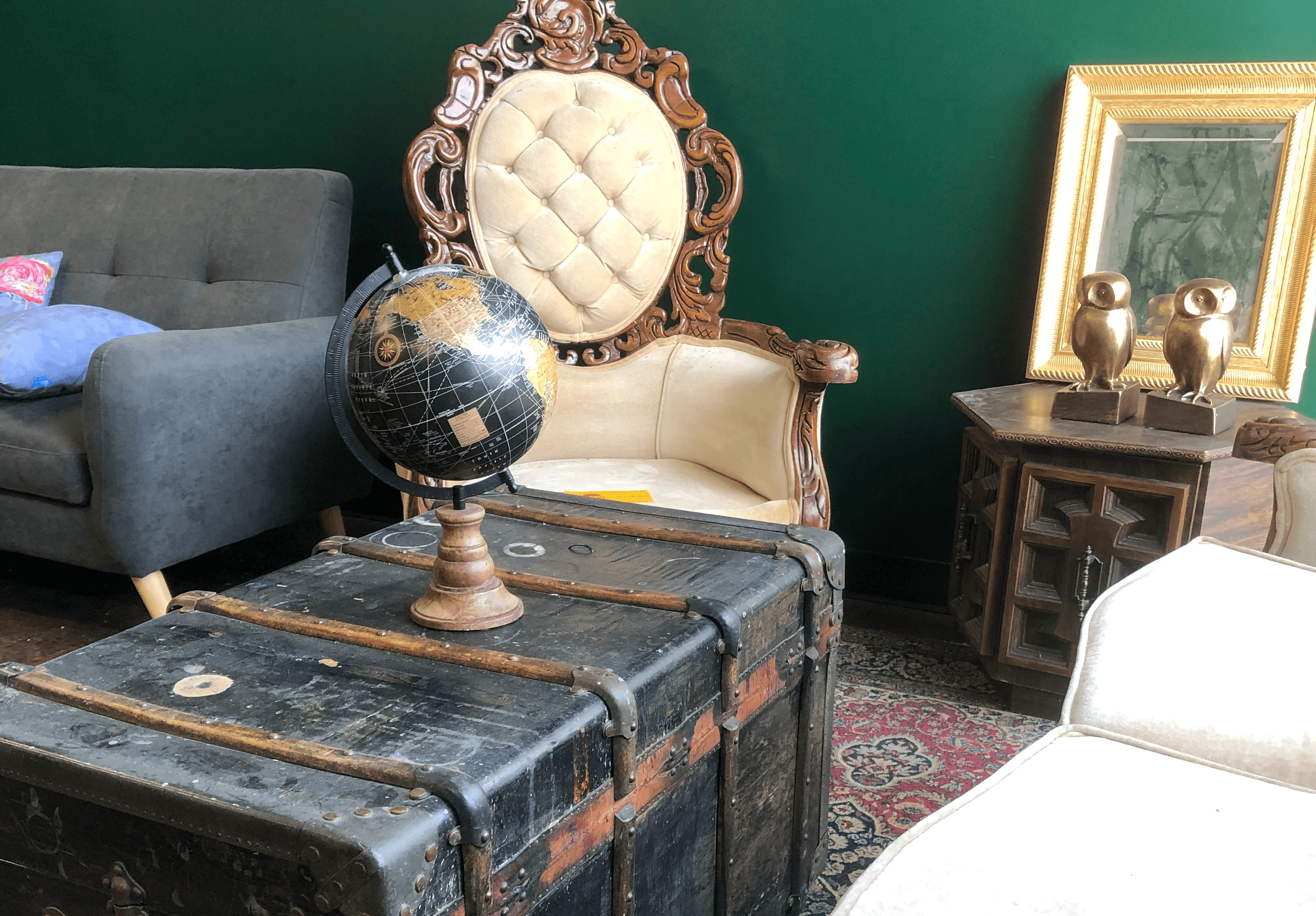 Some of our scavenging is starting to pay off, like in this cozy little seating corner with some fun vintage touches. None of this stuff was bought new; we’ve been haunting thrift stores, estate sales, and stealing stuff out of our friends’ apartments (kidding!) to flesh out this funky, whimsical environment.
